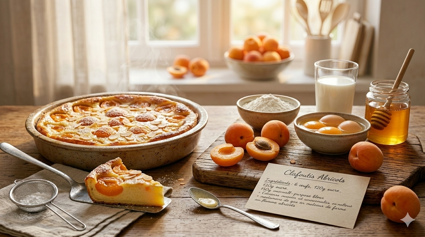 Originaire du Limousin, le clafoutis tient son nom de l’occitan clafir, qui signifie "remplir" — on remplit littéralement le plat de fruits et de pâte. À l’origine, on le préparait avec des cerises noires, souvent entières avec leurs noyaux. Avec les générations, les familles ont naturellement adapté la recette aux fruits de saison : les abricots s’y prêtent à merveille, avec leur chair acidulée, leur parfum ensoleillé et leur texture fondante après cuisson.